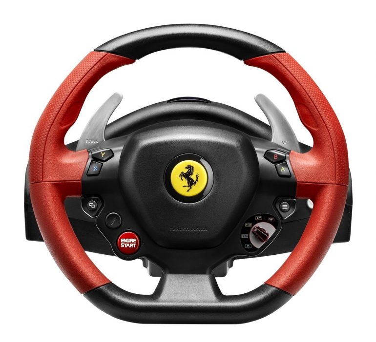 Koło o średnicy 28 cm pewnie leży w dłoniach, umożliwia obrót o 240 stopni i automatycznie wraca do pozycji wyjściowej w momencie puszczenia (autocentrowanie). Oferuje ponadto cztery ustawienia czułości. Po bokach – identycznie jak w prawdziwym Ferrari 458 Spider – zamontowano metalowe łopatki umożliwiające szybką zmianę biegów.